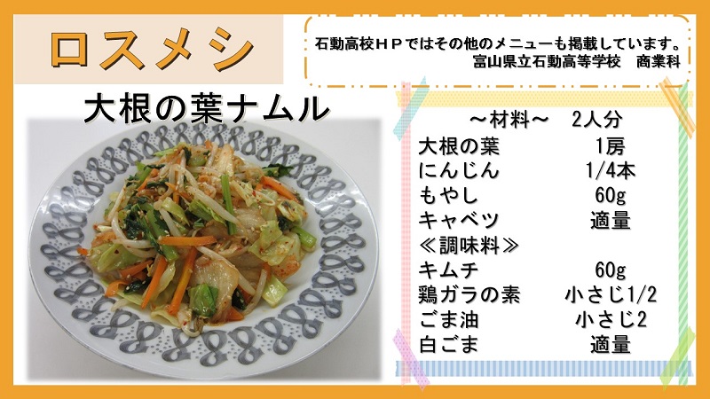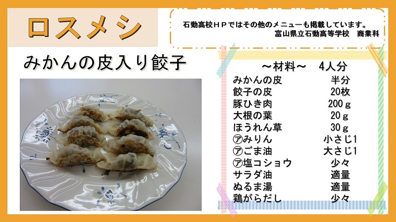 このページは、商業科生徒が、【課題研究】として、食品ロスをなくすために、調査や関係機関の協力の下、おすすめする『ロスメシ』レシピを掲載しているページです。『ロスメシ』については、商業科 【課題研究】のページで紹介中です。