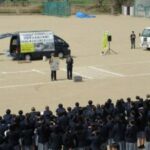 今年度の交通安全教室は、スタンドプロダクション(有)シャドウ様のスタントマンの皆様により、生徒の目の前で事故の実演をしていただきました。