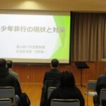 講演では「少年非行の現状と対策」と題し、近年、社会の複雑化とともに、青少年による犯罪が増加し、地域社会や教育現場において深刻な問題となっている中で、青少年犯罪を未然に防ぐために必要な施策、支援体制、そして地域や家庭、学校が連携してどのように犯罪予防に取り組んでいくべきかについて、実際の事例を挙げて話していただき、大変勉強になる講話となりました。